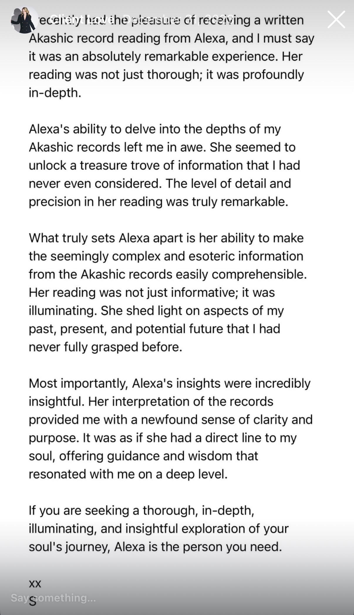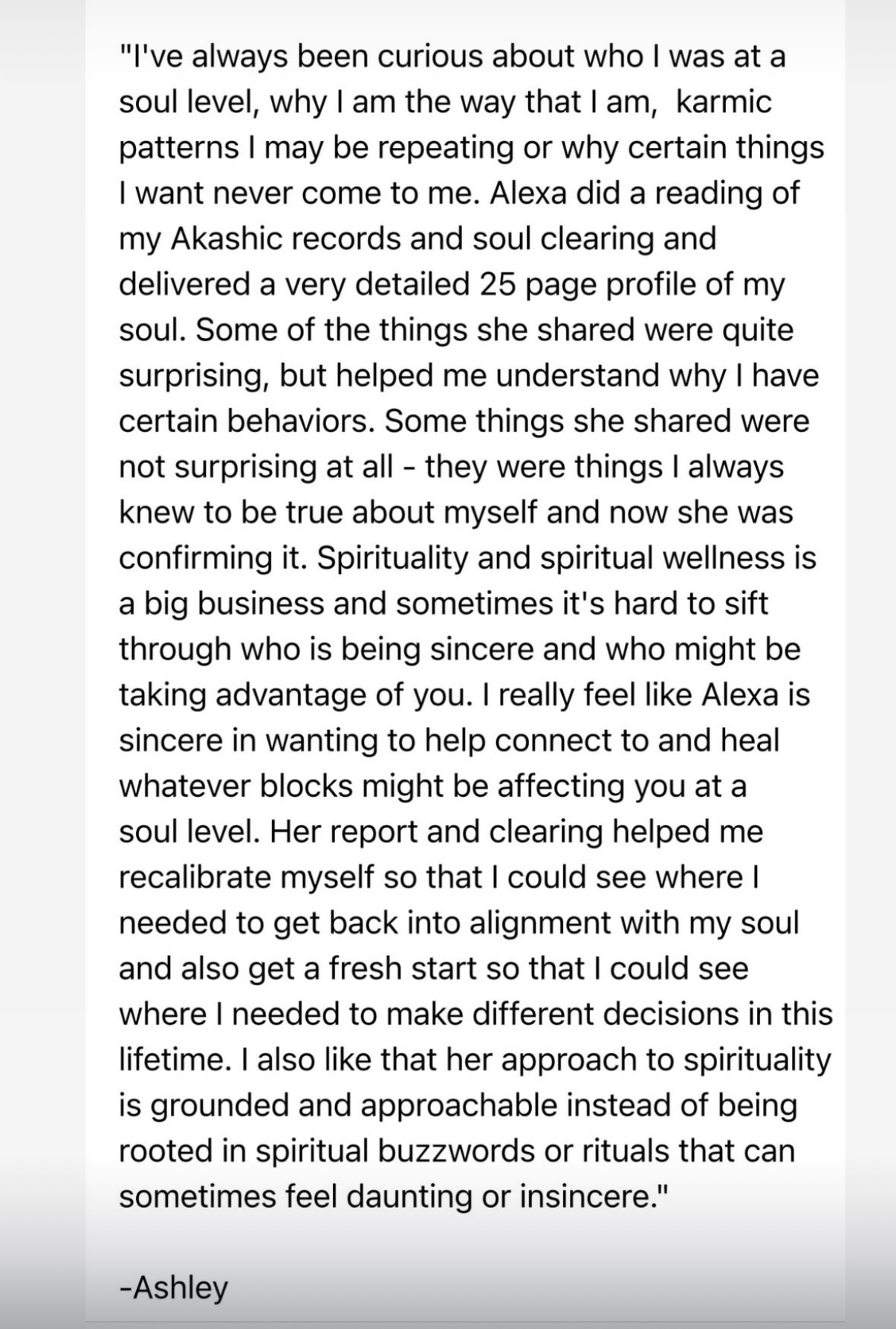 Absolutely stunning! I came to Alexa with so many questions about my past lives, family, and personal life purpose. She helped me find answers and clarity on everything! 10/10 highly recommend!
