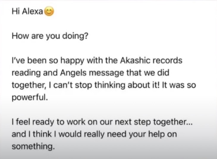 I felt deeply supported in my session with Alexa! She was amazing and gave me new and thoughtful insights into so many things about my life that resonated with me so much. My focus and inquiry was love and romance and Alexa's reading of my Akashic records reminded me to surrender into the work I have already done while calling in a partner and family. The way Alexa holds space is incredible. I felt completely seen and understood. It was also so so great to feel totally magnetic after our session. Highly recommend!